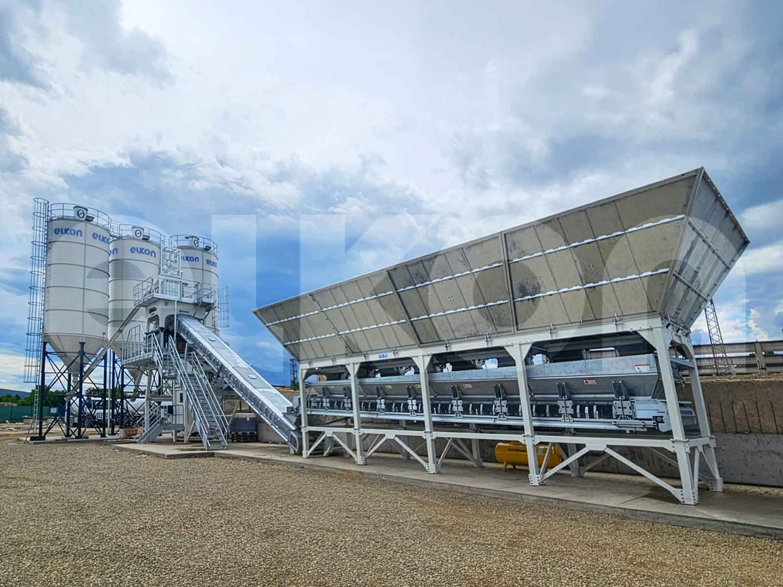 At the core of the plant is the ELKON twin shaft mixer, delivering up to 160 yd³/hour of concrete production capacity. This setup provides consistent mixing performance and high-quality output suitable for infrastructure, industrial, and ready-mix applications.